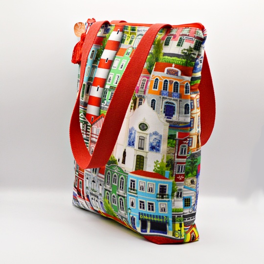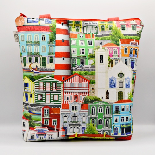Handmade bag with images of Aveiro, the façades of the houses, its canals with the moliceiros, the houses on the Costa Nova and monuments such as the Vera Cruz Church, the Barra Lighthouse and the Train Station.