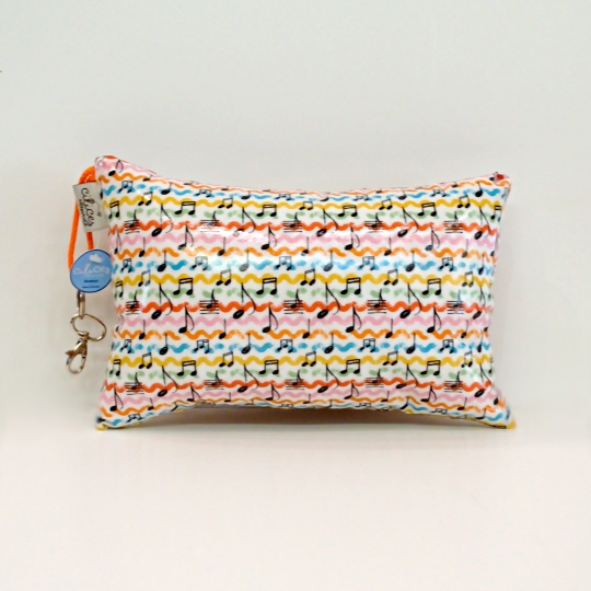Beach cushion in laminated fabric with images of music notes.