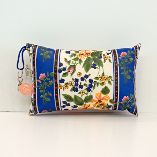 Beach cushion in plasticized fabric with Alcobaça cheetah pattern and blue bars.