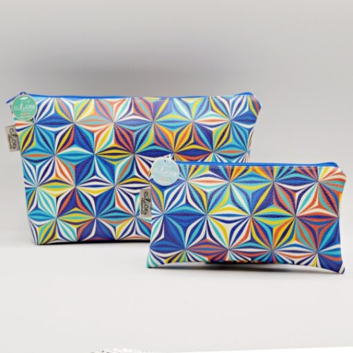 Textured nappa purse with a geometric pattern in shades of blue, red, yellow and white.