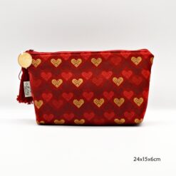 Handmade fabric purse with red and gold hearts.