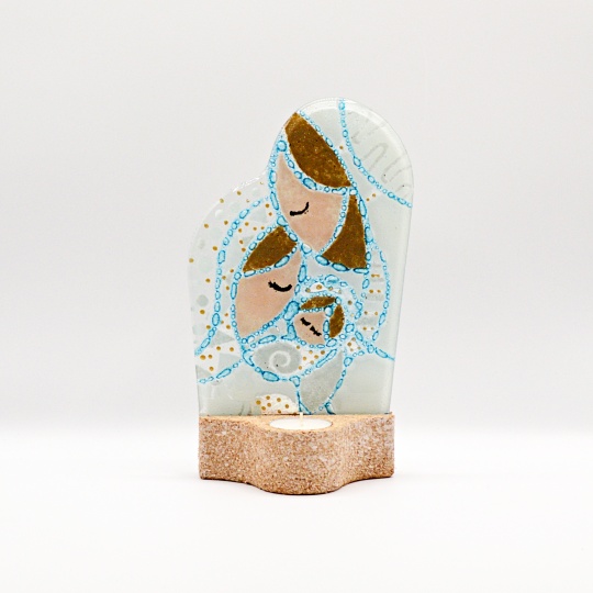 Holy family in glass with cork base for two candles.