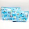 Double purse in fabric with hot air balloons and plain dark blue fabric.
