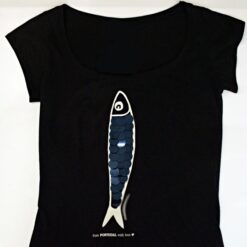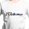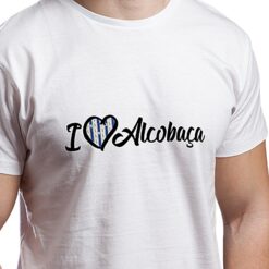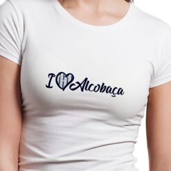 100% cotton white T-shirt with “I Love Alcobaça” and a heart printed with the Alcobaça chita pattern in blue.