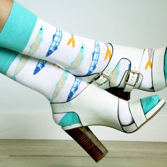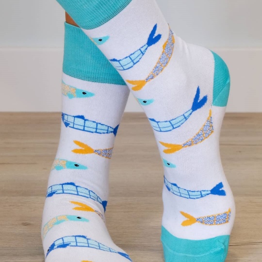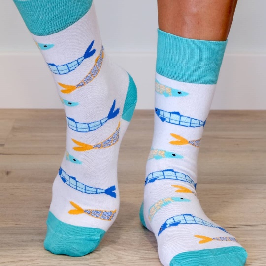 Meias com padrão inspirado num dos ícones da Cultura Popular Portuguesa, a Sardinha e na herança arquitetónica, o Azulejo Português Estas meias são feitas em Portugal e não têm costura para um maior conforto. Composição: 80% Algodão Penteado; 17 % Poliamida; 3% Elastano
