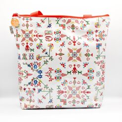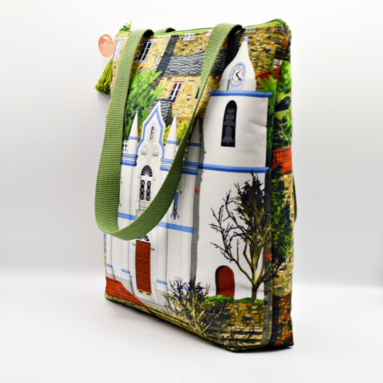 Handmade bag with images of Piódão, its schist houses, the church of Nossa Senhora da Conceição, the chapel of S. Pedro and the bridge at Foz d’Égua.