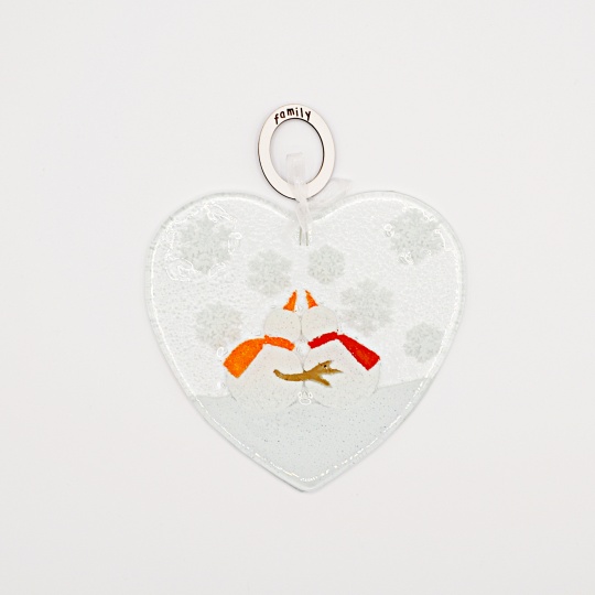 Heart-shaped glass pendant with image of two snowmen, entirely produced in Portugal.