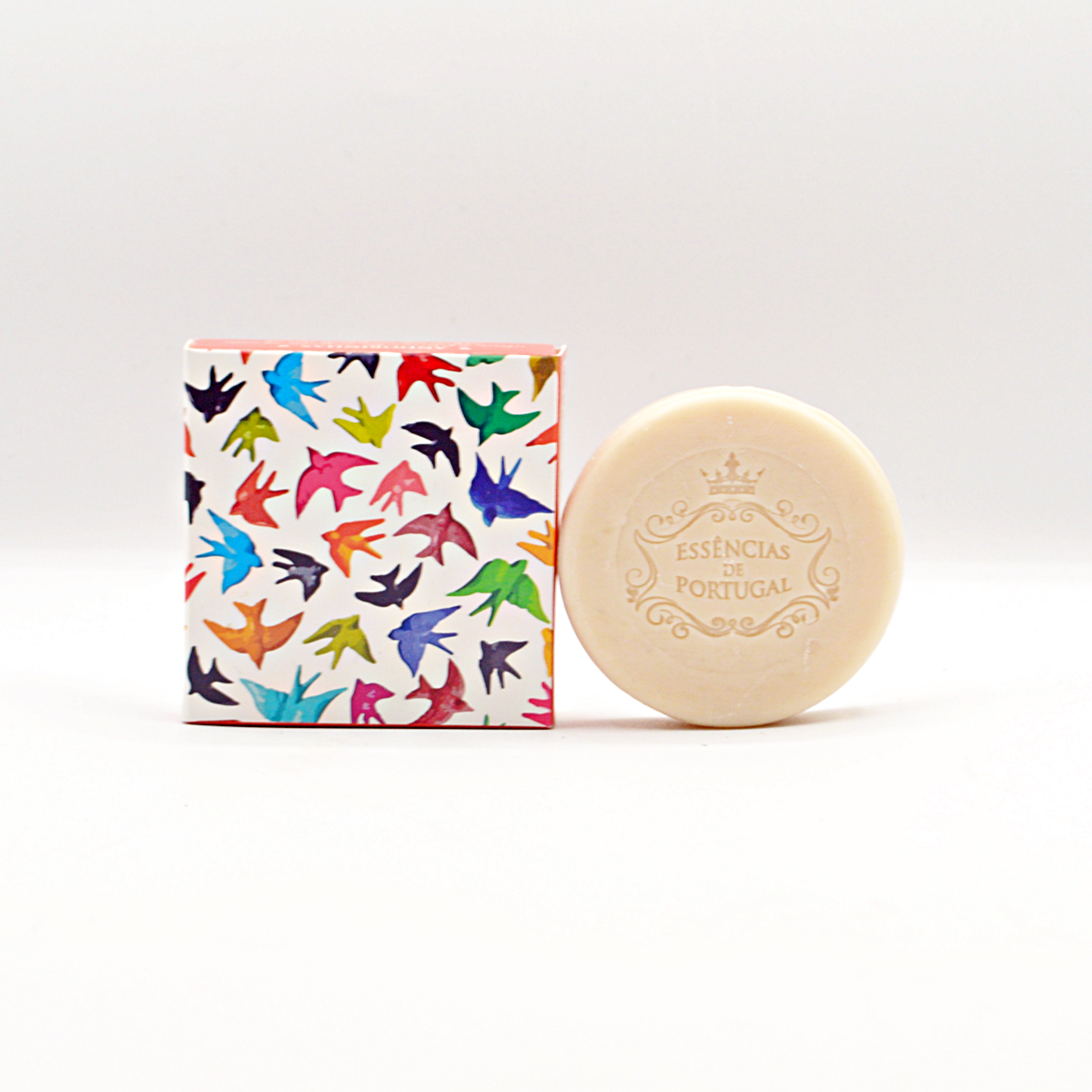 50g aromatic soap, enriched with glycerin and pure olive oil, in a box decorated with colorful ceramic swallows.