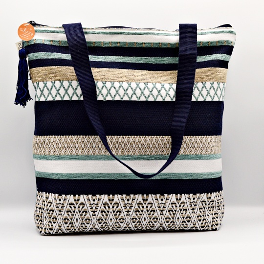 Handmade bag with tapestry fabric on one side and plain blue on the reverse.