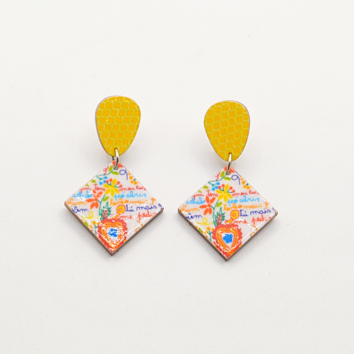Wooden earrings with images of Valentine’s Day handkerchiefs.