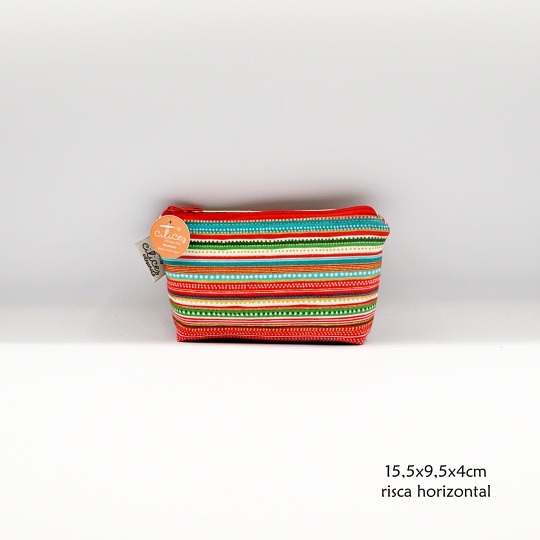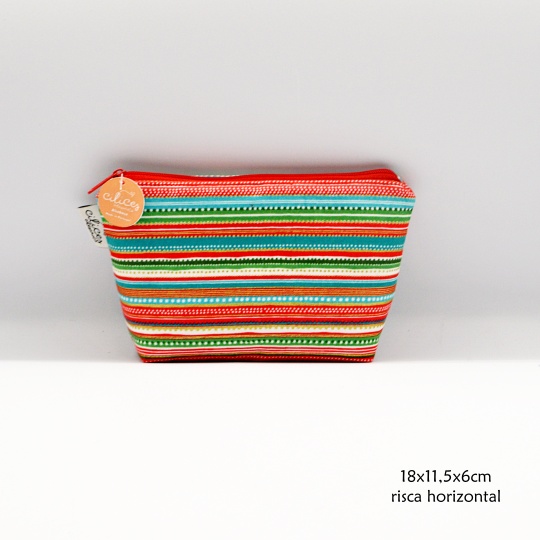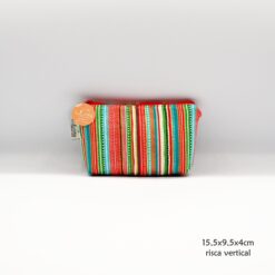 Bolsa feita à mão com padrão com bolas e riscas de várias cores.