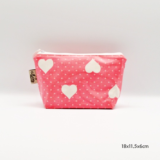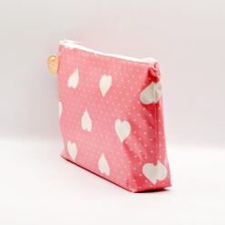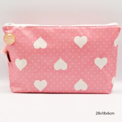 Bolsa com corações brancos e fundo em rosa com bolinhas brancas.