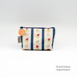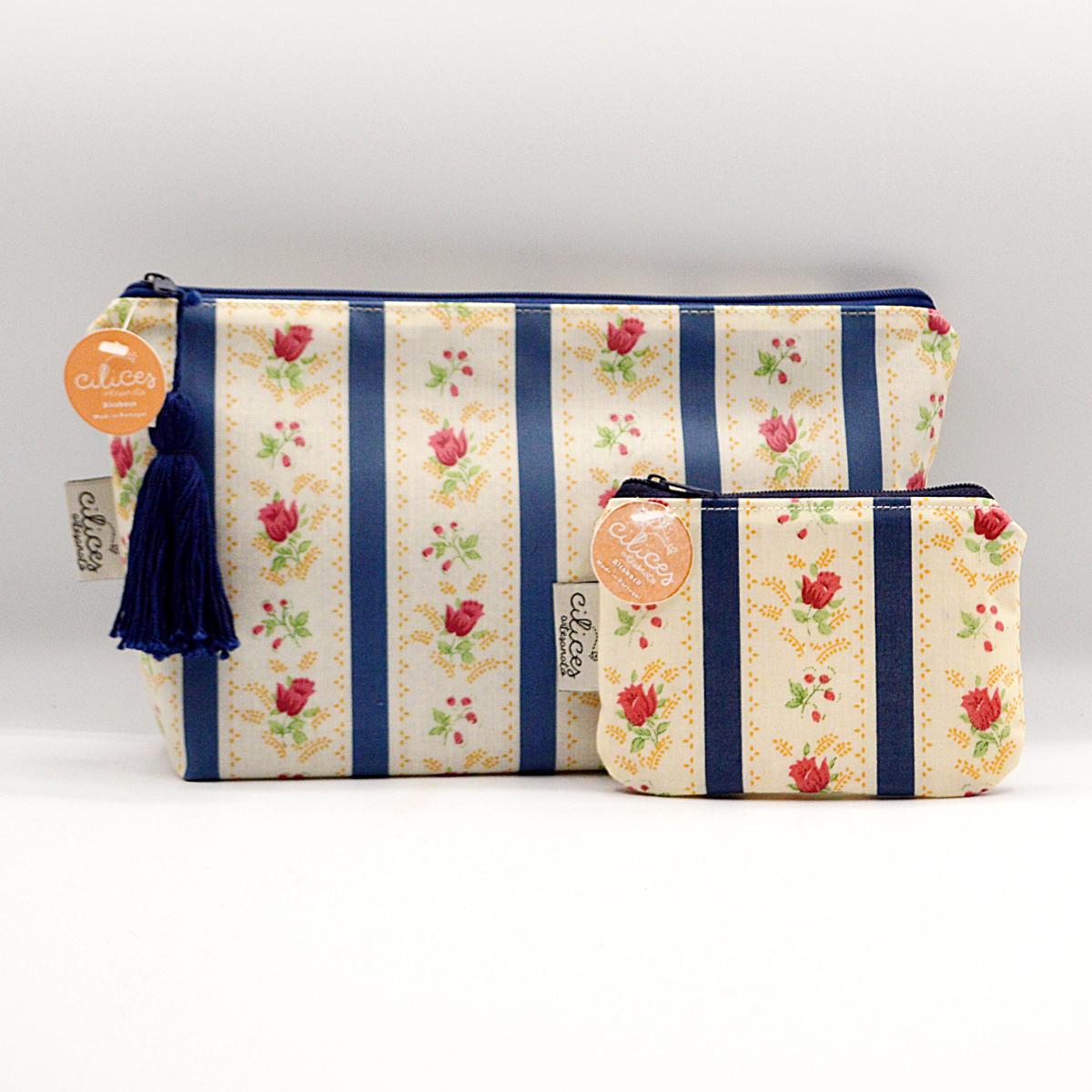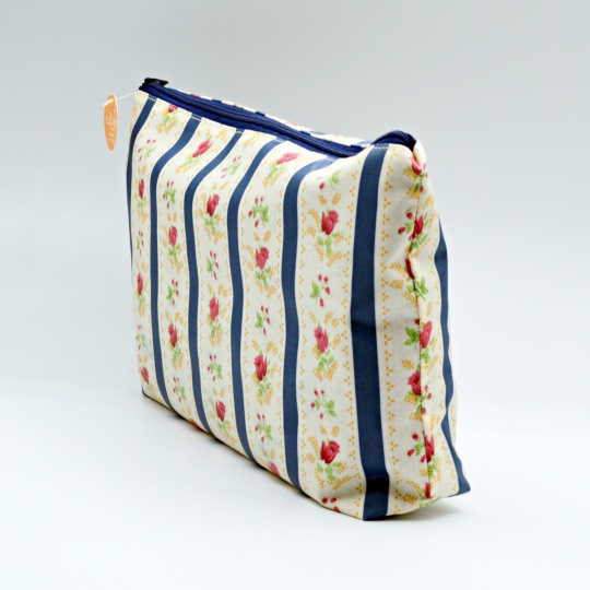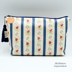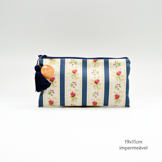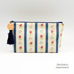 Bolsa feita à mão em tecido plastificado com padrão da chita de Alcobaça Pombalino azul escuro.