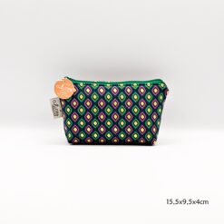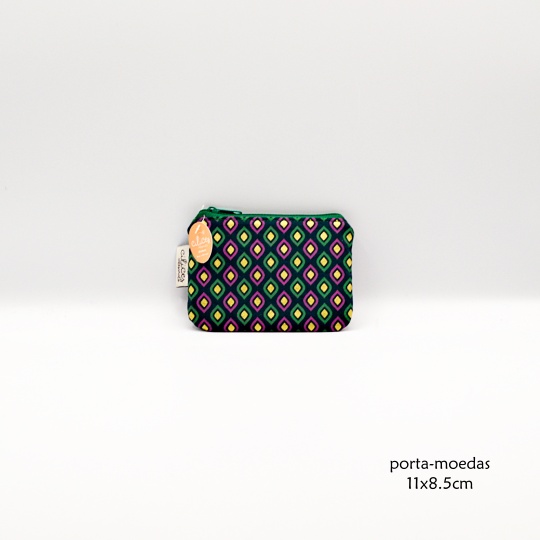 Bolsa feita à mão com losangos em tons de verde, rosa e dourado.