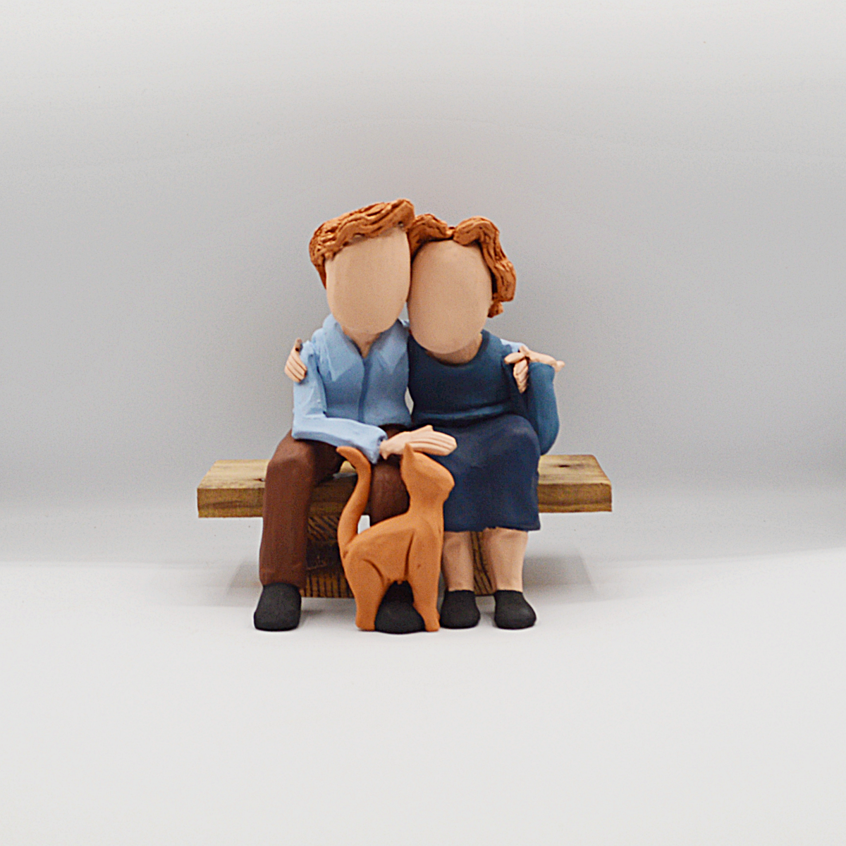 Casal em cerâmica sentado em banco de madeira com um gato, totalmente produzido em Portugal.