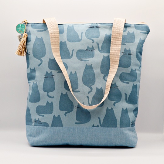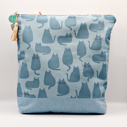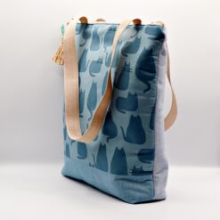 Mala feita à mão com imagens de gatos de um lado e azul no verso.