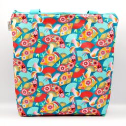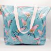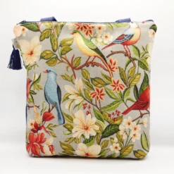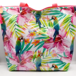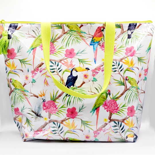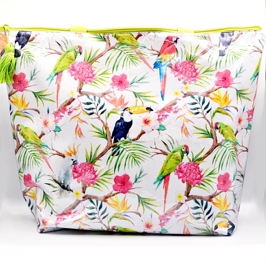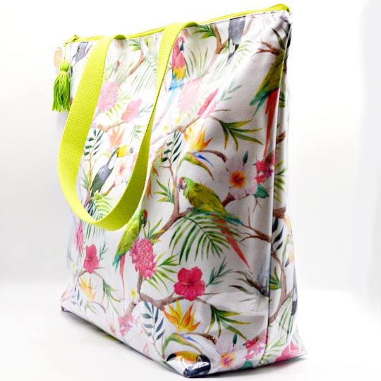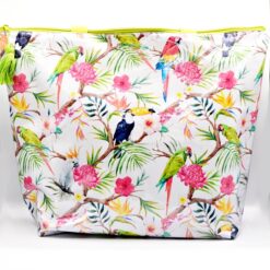 Mala com padrão com pássaros e flores, ideal para levar para a praia ou piscina.