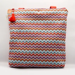 Mala feita à mão com tecido tapeçaria com motivo étnico de um lado e vermelho liso no verso.