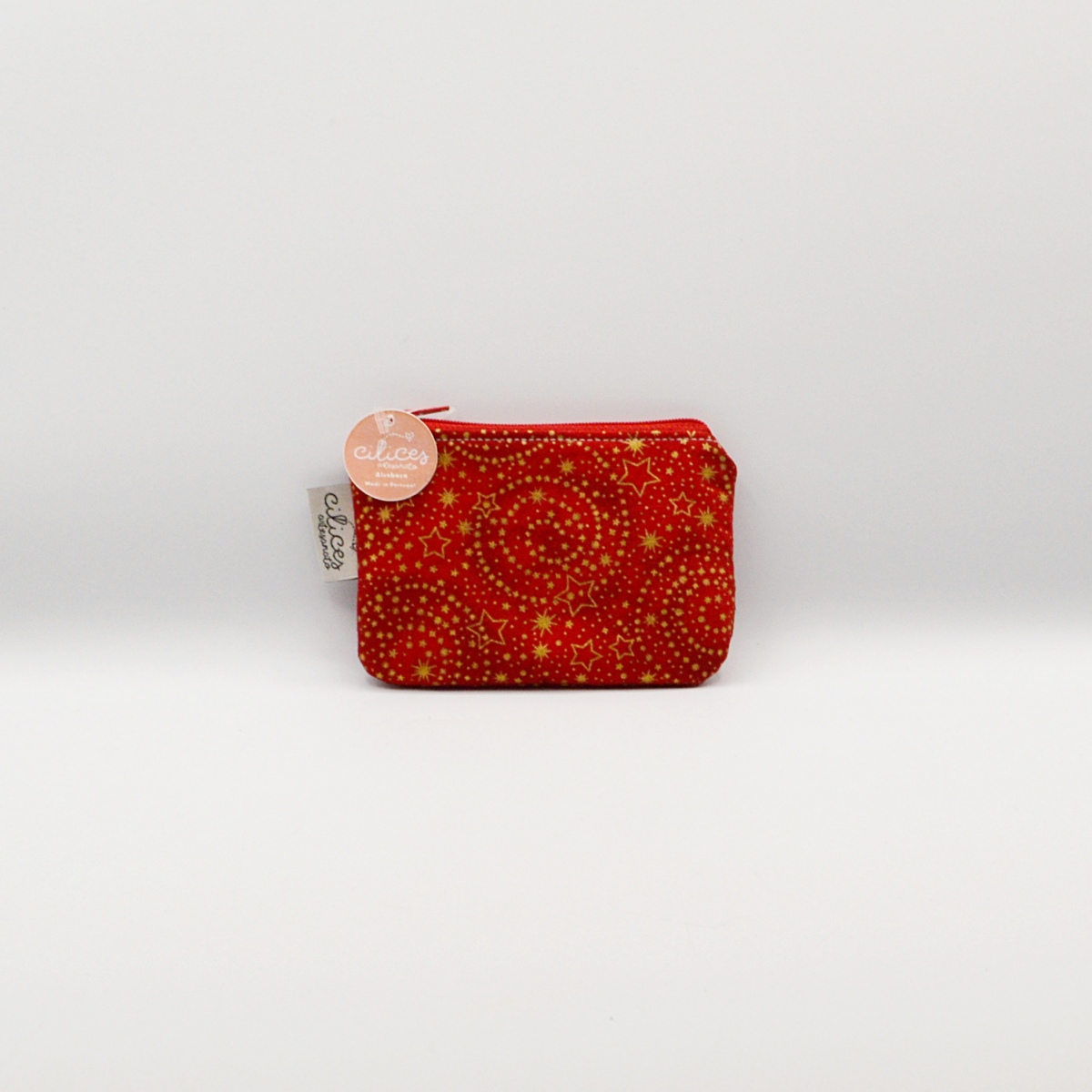 Porta-moedas feito à mão, em algodão com estrelas douradas e fundo em vermelho.